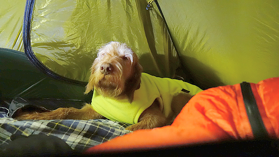 Ik lag dus – zoals gezegd – veel te dicht op de binnentent. Niet nodig maar lastig om gedurende de nacht met woef ook in de tent te veranderen.
