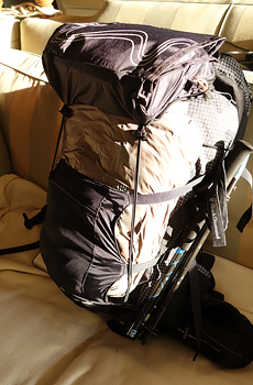 De rugzak lag bij mijn hoofdeind. In de 4L losse pouch zaten de dingetjes die ik meteen nodig zou kunnen hebben zoals mijn bril (daarover meer), extra sokken, handschoenen. Wat ontbrak was een microvezeldoekje, dat zat in de rugzak. Ook een bidon met water bij de hand.