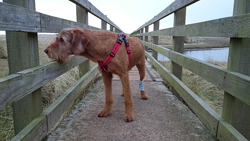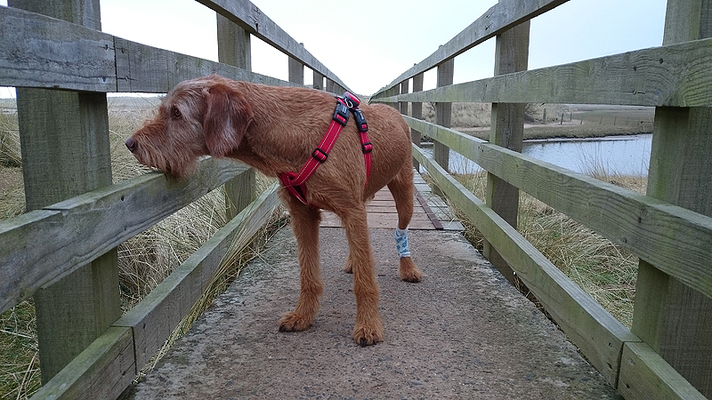Vandaag had ik niet zo heel erg veel tijd voor een rondje en bovendien moest ik ook even kijken hoe dat zou gaan met het pootje van waf. Ze is 5 weken zonder antibiotica geweest en alles ging prima, maar gisteren vielen er ineens 2 gaten in de zwelling die nou juist zo prachtig aan het wegtrekken was en waarvan het huidje mooi heel was geworden. Dat was dus even een domper maar de hoop is toch dat het weer zonder infecteren dicht gaat allemaal. Dus ze kan prima lopen maar dan wel ingepakt om te voorkomen dat er rommel bij komt. Maar ze is ook loops, dus het was even zoeken naar een route waar het niet te druk was en waar geen modder zou liggen.