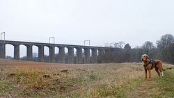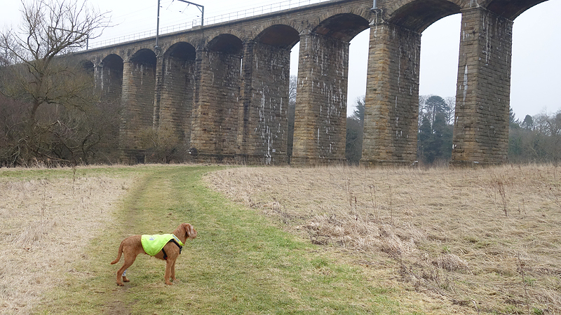 Het ging allemaal heel snel eigenlijk en we hobbelden al snel langs de river Aln op weg naar de stepping stones. Daar deed ik wafje het gele signaaljasje even aan omdat er weer gekken aan het schieten waren. Maar ik zag ze niet en het was niet veel, maar voor de zekerheid dan maar even aangetrokken. Het loopt daar wel lekker. Het is een mooi vredig stukje, waarbij de spoorbrug natuurlijk een mooi punt blijft om naar te kijken. Maar het loopt ook gewoon lekker, zelfs met dit sombere weer van vandaag. De vorige keren dat ik hier liep was het net lente.