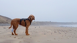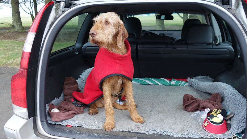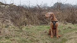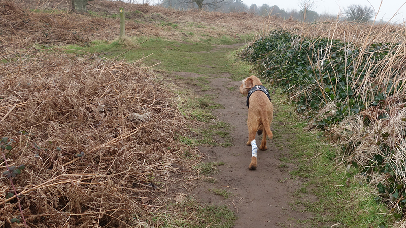 Ik ben niet overgestoken omdat ik niet wilde dat waf een nat verband kreeg met haar wonden. Ik keerde dus weer terug en wist ook dat de route ongeveer 17 km zou worden en dat leek me wel weer genoeg. Waf had haar stoere grote harnas aan van de rugzakken, en dat was ook even wennen voor haar natuurlijk dus dit was lang genoeg.