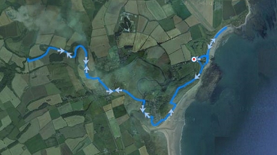 Daarna over het pad langs de golfbaan en dat lag er vrij aardig bij eigenlijk. Al snel liepen we weer langs de bunker, naar beneden naar de parkeerplaats bij Alnmouth, door het dorpje langs de bootjes over de brug, stukje over de weg, bij de rotonde rechtsaf en weer linksaf het weiland in en dan de klim. Ik kan het dromen, al loopt de ultra natuurlijk de andere kant op.