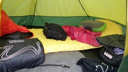 Het blijkt tot mijn teleurstelling een hele grijze bewolkte ochtend te zijn en niet de beloofde stralende morgen. Ik had me er zo op verheugd om lekker een luie ochtend in de zon bij de tent te hebben maar dat zit er niet in.
