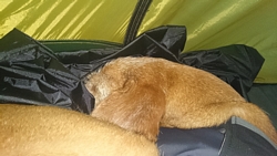 Vandaag word ik niet eens zo erg vroeg wakker in de tent en kan ik blijven dommelen tot na 07.00 uur zelfs. Dan besluit ik er toch maar eens uit te kruipen en met de hond te gaan wandelen die tot mijn verrassing niet om haar eten kwam zeuren in de vroege ochtend. Ook nooit weg! Het verslag van dag 1 van deze camptrip staat hier.