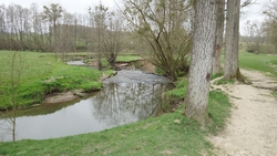 Ik start weer over het stukje weg waar ik gisteren ook heb gelopen aan het einde van de run. Ik ga terug door de boomgaard maar ik kies voor de weg op de heenweg. Het is wel fraai met dat beekje dat door het landschap loopt en overal hoor je vogeltjes ondanks de sombere ochtend.