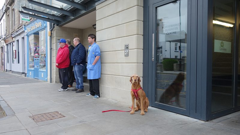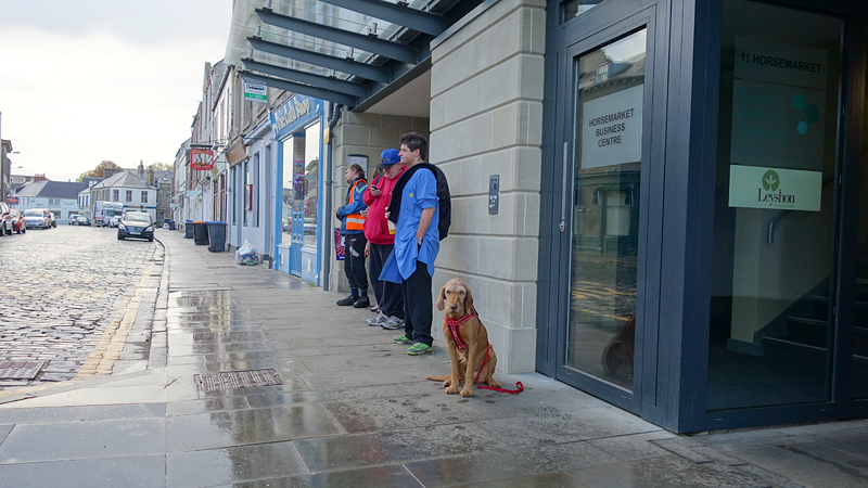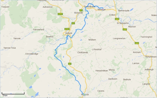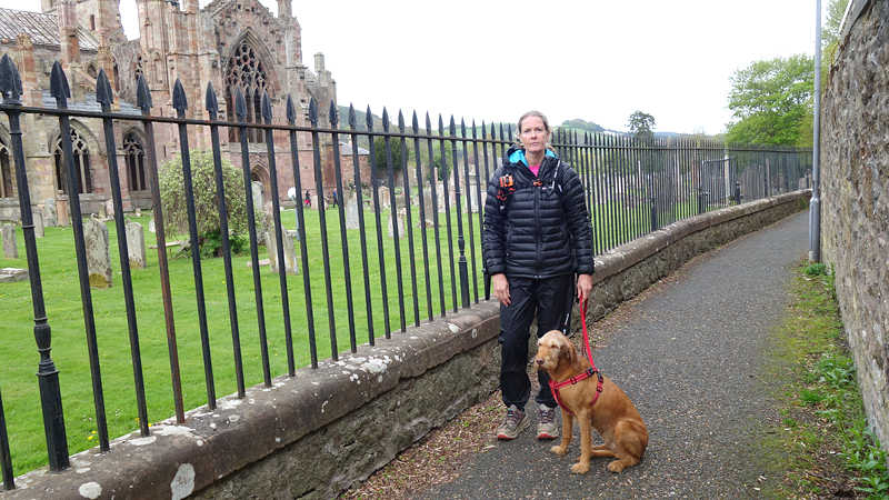Vandaag is het dinsdag en gaan we op pad voor de de tweede dag van de borders abbey way. De route zal vandaag van Hawick naar Melrose gaan via Selkirk. Gisteren hebben we ruim 46 km gelopen en dat is allemaal goed gegaan. Ziva doet het prima en heeft totaal geen stijfheid laten zien. Ze vond het vanmorgen weer leuk om mee te gaan gelukkig, want ik laat alles van haar af hangen. Zodra zij tekenen vertoont van stijfheid of vermoeidheid stop ik natuurlijk of sla ik een dag over maar tot nu toe gaat het allemaal goed. Even na half 8 staan we dus weer bij de bekende bushalte in Kelso waar hetzelfde handjevol mensen staat te wachten als gisteren. Let maar eens op de man in de blauwe jas. Ook de dikke man in zijn rode hoodie is weer present en ook deze keer eet hij weer een zak chips in de bus, spoelt dat weg met cola en neemt een bar als toetje. Ongelooflijk.