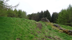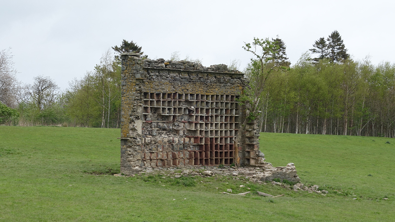 Helaas zijn er niet alleen velden met schapen, maar ook met enge koeien. Ik kom ineens op een veld met alemaal jonge koeien. Gelukkig zonder moeder maar ze zijn blijkbaar net buiten want ze zijn razend nieuwsgierig en komen met z’n allen aanrennen om eens gezellig te kijken. Maar ik vind ze niet leuk. Koeien zijn niet slim en denderen met evenveel plezier gewoon door of over je heen. Woef loopt los want die redt zich wel. In plaats dat ze nou woef doet, laat ze mij het vuile werk opknappen en ik roep van alles naar de dieren en zwaai met mijn armen. Ondertussen rommel ik door het modderige veld met gaten. Heel leuk. Rechts van me staan de resten van een dovecote. Toch even snel een kiekje ondanks de koeien die maar blijven volgen.