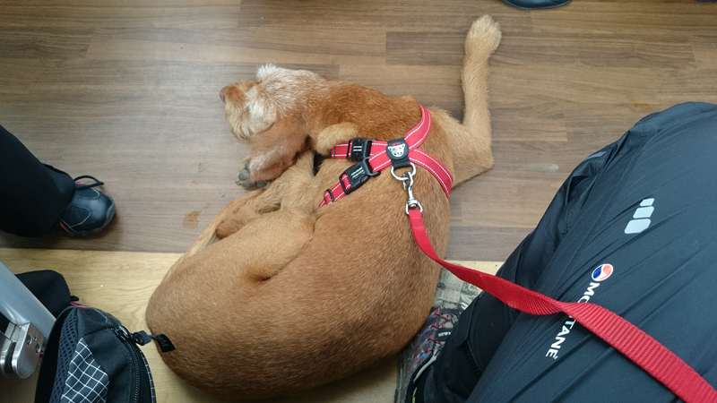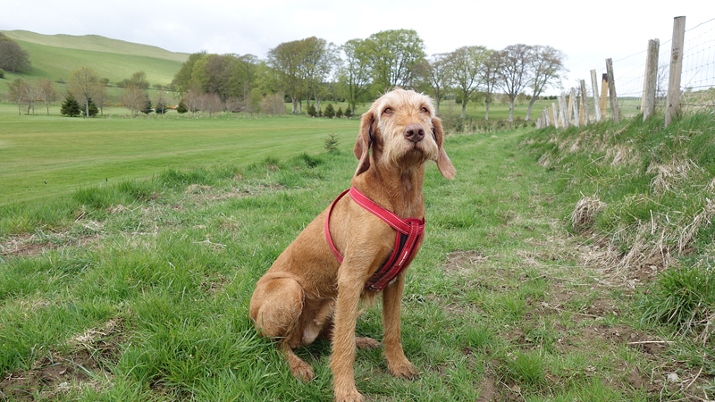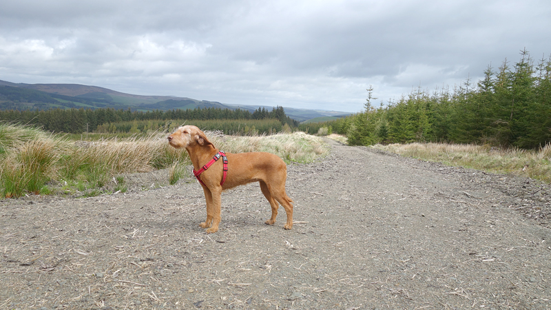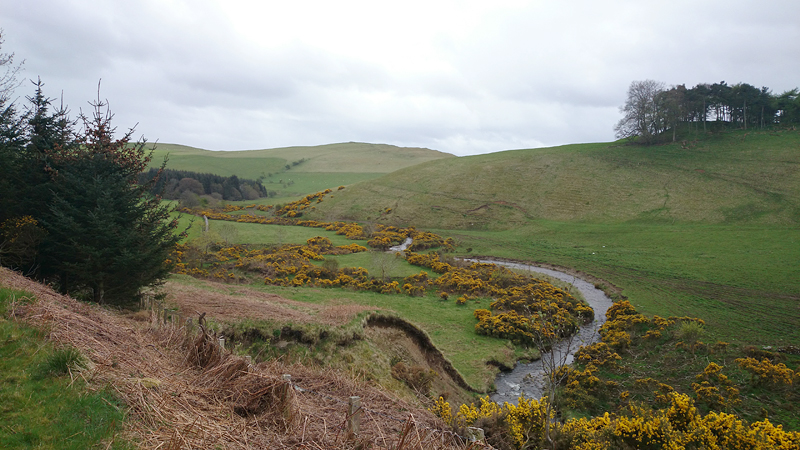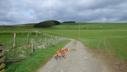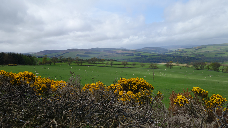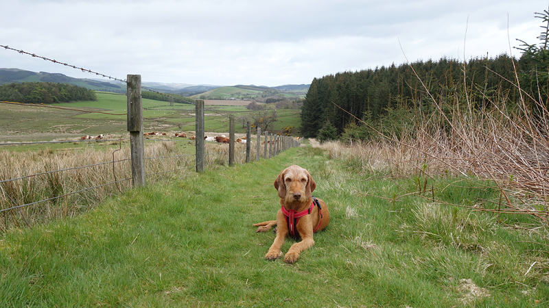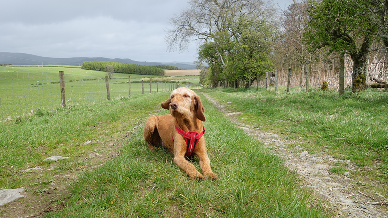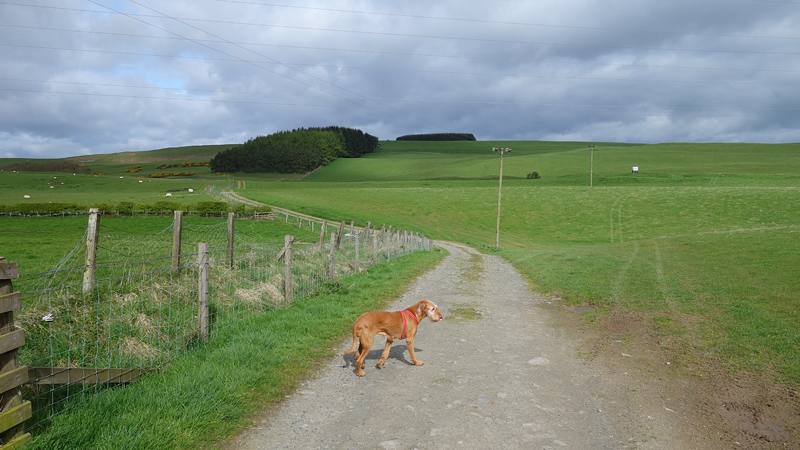 Ook deze keer is de bus weer tamelijk leeg en heeft woef een prima ligplaats waar ze rustig kan reizen. Na een uur zijn we weer in Hawick. Ik weet nu waar ik moet beginnen met de route en al snel zijn we op de juiste weg.