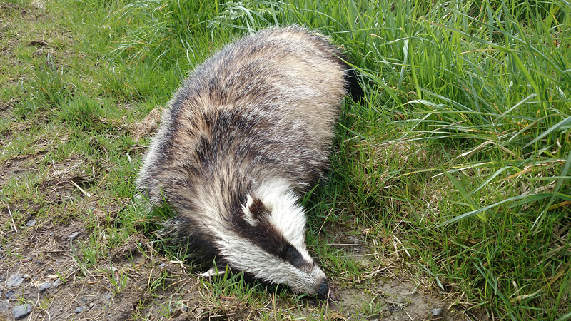 Op de weg ligt een fraaie das die blijkbaar aangereden is. Hij is dood maar ziet er onbeschadigd uit.