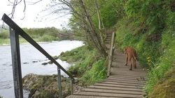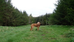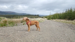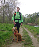 Ik kom langs het water iemand tegen die ook aan het joggen is met 2 honden. We raken aan de praat en het blijkt een nederlandse te zijn die al 20 jaar in schotland woont. We kletsen wat ik vertel over de route en dat deze tweede dag eigenlijk een beetje saai is. Zij kende de BAW niet, maar we de andere routes die vlakbij lopen. Ze maakt een foto van de hond en van mij.