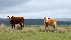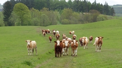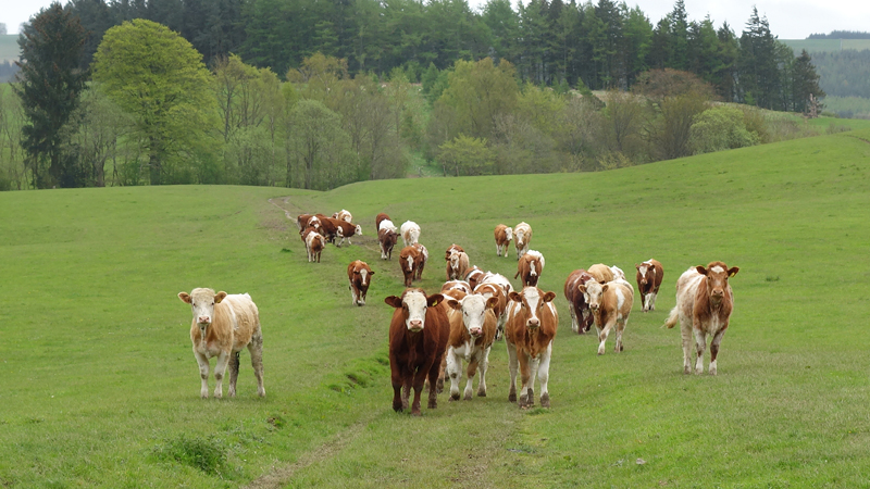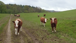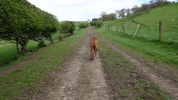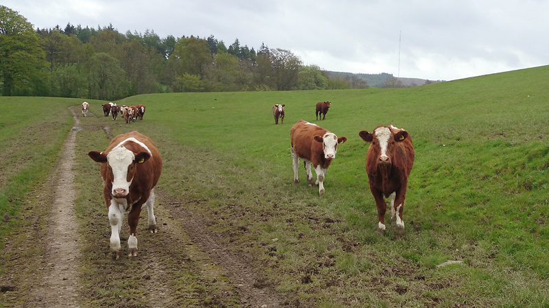 Dan komen we eindelijk weer eens op een mooi open stuk met een goed graspad om op te lopen. Het uitzicht is fraai, het is weer iets lichter en er staan prachtige koeien in de wei die fotogeniek staan te loeren naar mijn kalfje.