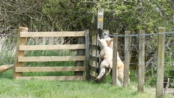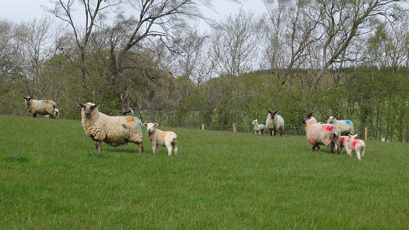 Daarna gaan we door een veld met heel veel schapen en enorm veel lammetjes. Woef kijkt niet op of om maar omdat de boerderij dichtbij is, doe haar maar even aan de riem. De lammetjes zijn schattig maar 2 lammetjes zijn aan de verkeerde kant van het hek uitgekomen en proberen weer naar moeders te komen. Dat lukt natuurlijk helemaal niet en de ooi loopt zenuwachtig heen en weer langs het hek. Domme kinderen.