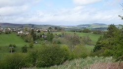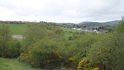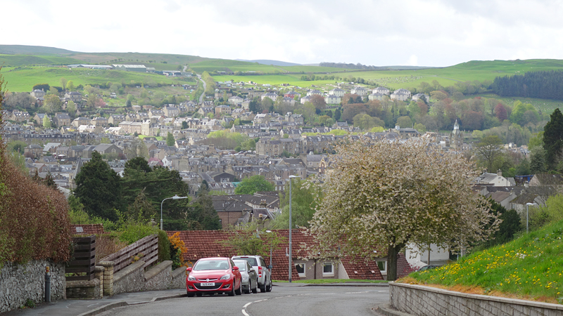 Ik weet al dat we een heel stuk nu eerst gaan klimmen naar het hoogste punt vanaf Hawick. Vandaag loop ik met de klok mee, zoals het beschreven is in de folders. Overigens staat daar dat je Selkirk naar Hawick ook in tegengestelde richting kunt lopen zodat je lekker over de weg naar beneden kunt lopen richting Hawick aan het einde, maar ik loop nu eenmaal met de klok mee en zal dus moeten stijgen. Welnu dat doet het want het valt helemaal niet mee op dat eerste deel. Eigenlijk wandel ik het hele eerste stuk en dat komt deels door mijn onervarenheid met dit soort lange routes en met het feit dat ik 3 dagen achter elkaar moet lopen. Dat heb ik op deze afstand nog nooit gedaan en ik heb geen idee hoe dat allemaal uitpakt straks. Voorzichtigheidshalve wandelen we dus naar boven. Gelukkig had ik al gelezen dat je bij het verlaten van Hawick af en toe om moet kijken omdat je dan heel mooi uitzicht hebt over het dorp en dat klopt. Ik stop dus even om een foto te maken want het is wel heel apart om Hawick zo tegen de berg op te zien liggen. Het is helaas geen helder weer maar het is met het oog wel erg mooi.