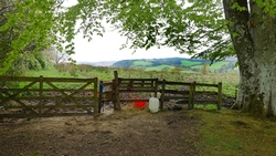 We klimmen weer over een hekje en de koeien zijn ons ht hele veld door gevolgd. Maar nu komen we weer op veilig terrein in het bos rond the Haining.