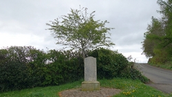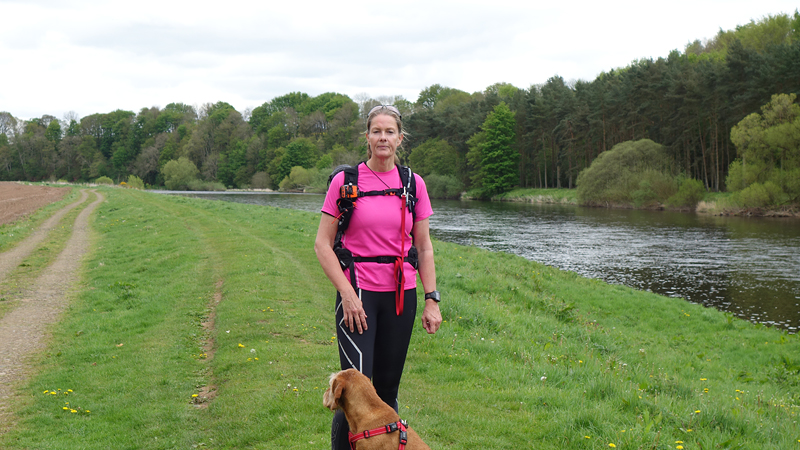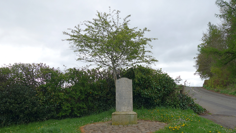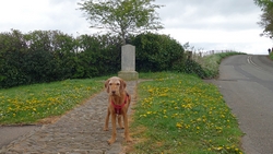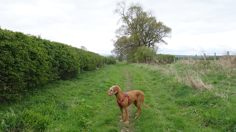 Hoewel we over een verharde weg lopen, is deze afgesloten voor verkeer. Heel rustig en er lopen wat paarden en in de verte loopt een wandelaar. Wat vredig allemaal en ik heb het gevoel dat het een top dag gaat worden. Gek idee dat er al 85 km in de benen zitten. Ik voel niks en woef heeft ook nergens last van geloof ik. We lopen verder en komen langs Rhymer’s Stone. Dat stelt niks voor maar het is leuk om te zien en het verhaal erachter te lezen. Als je het niet weet, zou je er zo voorbij lopen overigens. Thomas the Rhymer leefde tussen 1220 en 1297. Hij zou kunnen voorspellen en veel van zijn voorspellingen kwamen uit. De steen is de plek bij de Eildon Tree waarvan gedacht wordt dat hij geesten ontmoette die hem de voorspellingen zouden vertellen.