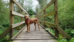 Hij vertelt ondertussen van alles over vissen, over de zalm en over zijn vakanties. Na een poosje maakt de man dan de foto van woef en mij. Ik lig in een deuk want de eerste foto heeft ook geen hond erop staan. Hij snapt er niks van en maakt nog een foto. Die is wel goed.
