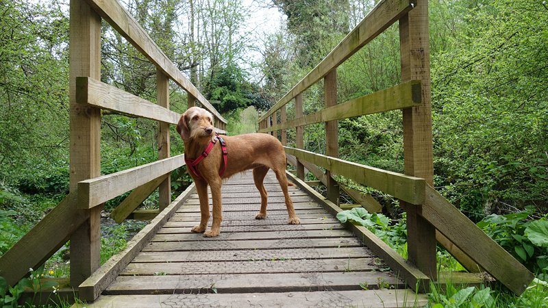 Als we het einde van het bos komen, wil ik de hond aan de riem doen en merk ik dat ik geen riem meer heb. Ik moet terug want ik weet zeker dat ik haar bij de drukke weg aan de riem had. Snel hobbelen we terug over het bospad en daar ligt inderdaad de riem op het pad. Gelukkig maar!