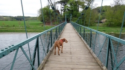 We nemen afscheid nadat we op de kaart hebben gekeken welke kant we op moeten. Net voor een brug zal hij straks aan de andere kant doorlopen. Ik ben benieuwd of hij wel de korte detour maakt naar de abbey van Dryburgh en de tempel of gewoon het pad blijft volgen. Ik ga in ieder geval de Dryburgh bridge over. De brug is uit de 20e eeuw en vervangt een oude brug van Capt Samuel Brown en is de enige optie om de rivier over te steken.