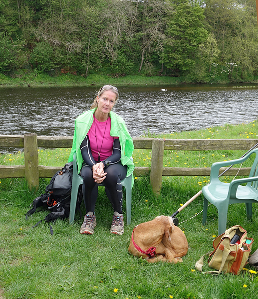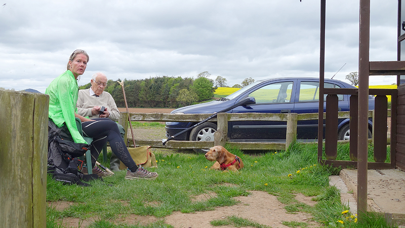 Op een bankje zitten twee wandelaars met grote rugzakken en ik vraag of ze ook klaar zijn. Ze blijken morgen de laatste etappe te gaan lopen van Kelso naar Jedburgh en doen dat als 6e etappe. Ze zijn doodmoe en snappen niet dat ik samen met de hond de route in 3 dagen heb gedaan. Ik ook niet maar we zijn er!