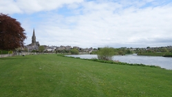 Ik sla rechtsaf en kom op een brede strook gras langs de rivier. Dit wordt de Cobby Riverside Walk genoemd. Links de kerk van Kelso al. Ik ben er nu echt bijna! Het weer is enorm opgeknapt en het zonnetje schijnt. Wat een prachtig moment om de route te beeindigen op deze manier.
