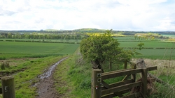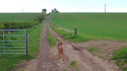 De route was prima te vinden en na de Tower liepen we door een veld waar prima te lopen was. Lekker even doorsukkelen! Jammer genoeg valt er even een klein miezer buitje uit de wolken maar daarna knapt het al snel weer op. Ik loop dwars over Westfield Farm en ik blijf het bijzonder vinden dat je gewoon over een erf mag lopen. Daar moet je in Nederland eens mee aankomen. Het is een enorme working farm maar bij het begin staat een rijtje fleurige roze huisjes. Daarna gaan we even een stukje omhoog het veld in maar met een prima pad.