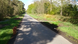 Dan houdt ineens het pad op en komen we op een drukke weg. Dat is even een verrassing want ik had gedacht dat het pad wel langs de weg ergens door zou lopen. Ik zie echter inderdaad een redelijk goed pad over een veld. Zou ik daar langs moeten in plaats van langs die weg? Ik ga het proberen en hoop dat ik aan het einde van het veld dan inderdaad weer een gat in de muur of een hek zal tegenkomen. Gelukkig blijkt dat ook zo te zijn. Ook nu in het boekje zie ik nog niet of dat nu de bedoeling was, maar ik ben goed uitgekomen.