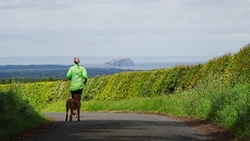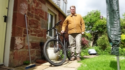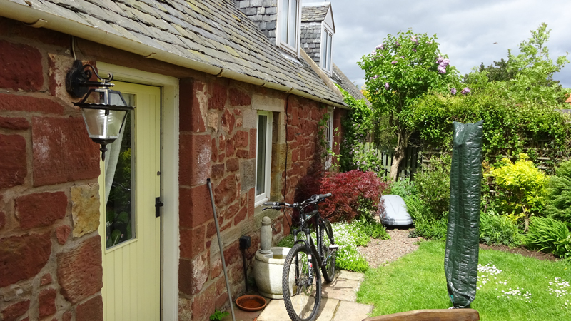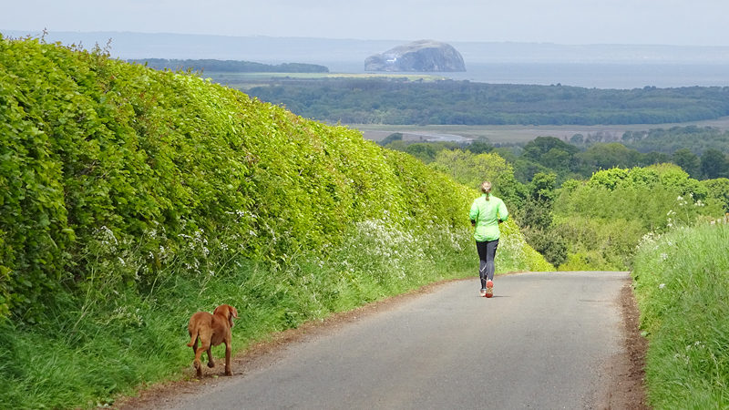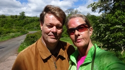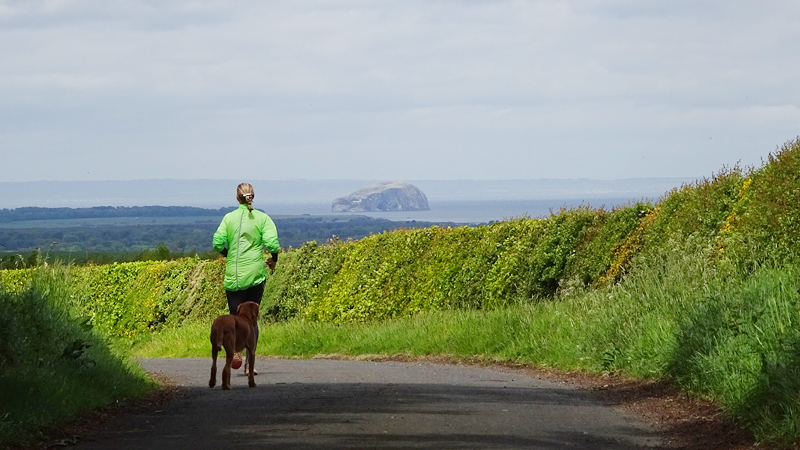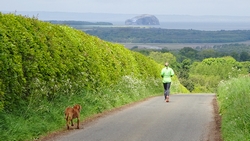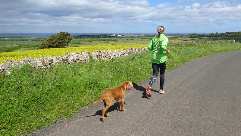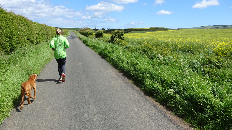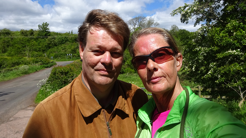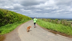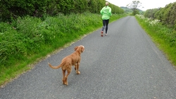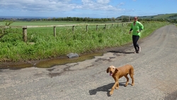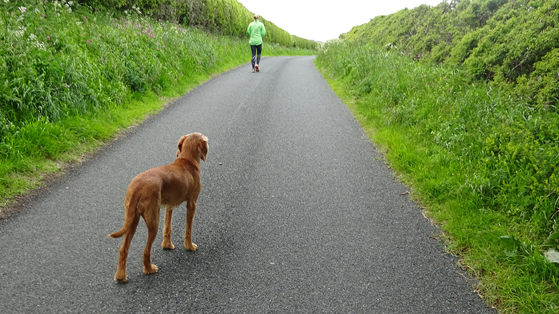 Vandaag is het alweer dinsdag. Gisteren zijn we niet meer in de avond gaan lopen want het stormde echt keihard en het regende ook flink. De eerste dag met echt veel regen. Vanmorgen waait het ook weliswaar stevig maar is het wel droog dus gaan we gauw op weg. We besluiten niet de heuvels in te gaan vanwege de wind maar nog een wegrondje te doen hier rond de cottage. Dat is toch ook erg mooi en nog steeds wel een uitdaging met de klimmetjes. Voor vandaag dan maar een continu rondje op MAF. Ik heb geen rugzak op en dat loopt natuurlijk weer super lekker. Woeffie heeft er wel zin in en jengelt al de hele tijd als ik me aan het omkleden ben. Ondertussen pakt S. de fiets en test de camera even.