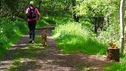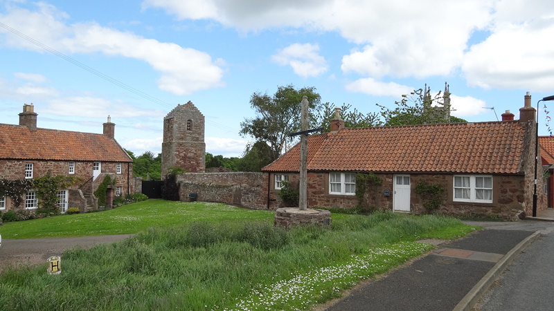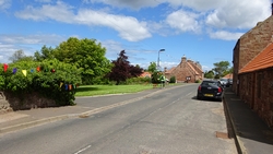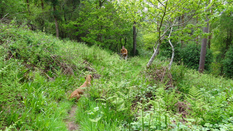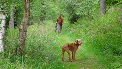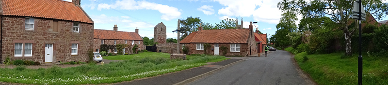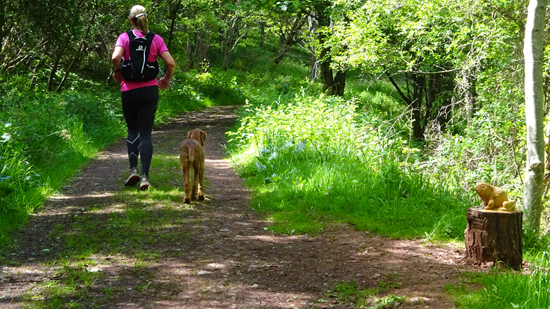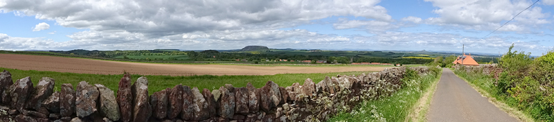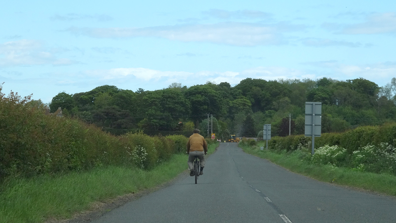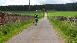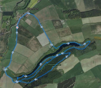 Vandaag is het best een aardige dag voor een loopje. Ik had gisteren al een rondje uitgezet dat deels door Presmennan Wood zou gaan. Dat leek me leuk en zou ook wel te doen moeten zijn met de fiets. Stukje over de weg, stukje door het bos, weer ver de weg, stukje dor onbekend groen en verder over de weg. Zo gezegd zo gedaan en al snel zijn we weer in Stenton waar we de auto parkeren. Vanaf daar even terug door het dorpje en rechtsaf omhoog richting het bos. Niet vanaf de parkeerplaats dus zoals ik de vorige keer deed.