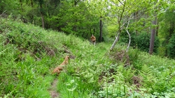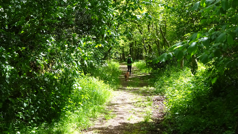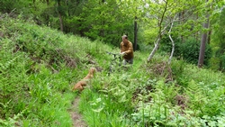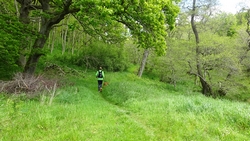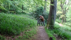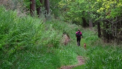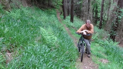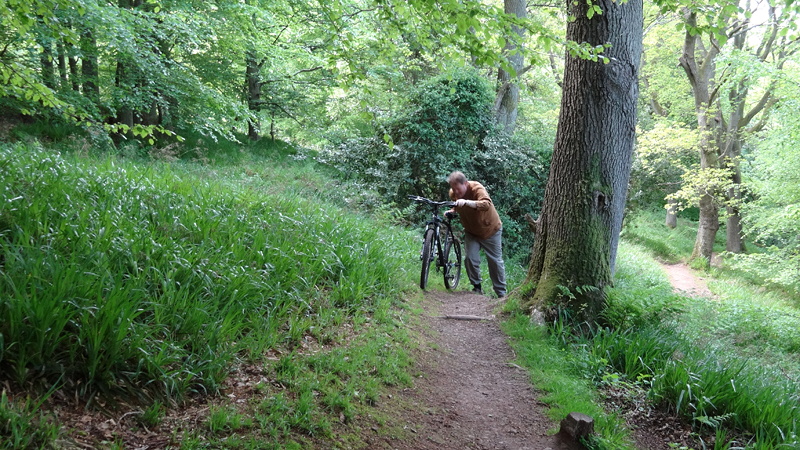 Als we het kinderpad gedaan hebben, slaan we linksaf en zullen daarna even een paadje omhoog moeten nemen die ons op het hoger gelegen pad zal brengen weer richting de parkeerplaats. Weet ik veel. We merken al snel dat het nauwelijks te doen is. Het loopt op sommige stukken bijna vertikaal omhoog. Maar dit jaar hoor ik geen gescheld achter me van S met de fiets. Hij is of stiller geworden, of sterker. Dapper duwt hij de fiets omhoog over het pad. Er is tenminste wel een pad, dat scheelt alweer.