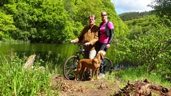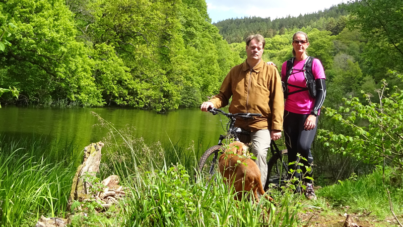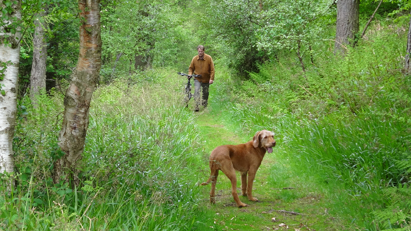 Als we het meertje over willen steken zien we dat het pad eigenlijk er nog even omheen loopt dus dat pad proberen we dan ook maar. Overigens had ik het ook zo ingetekend op de kaart blijkt na bestudering daarvan. Eens even kijken dan maar! Woef vindt alles leuk en tot nu toe is het met de fiets ook wel te doen.