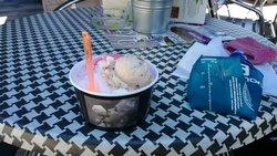 Voordat ik er erg in heb lopen we alweer Garderen in en richting mijn lunch break. Deze keer geef ik woef een lekkere appel op het terras om te voorkomen dat ze weer met een lege maag zielig gaat zitten doen en deze keer gaat ze rustig slapen terwijl ik geniet van mijn tosti en chocomel en ijsje. Mjammie wat een verwennerij. Zou ik genoeg kilometers maken voor deze zonde? Woef wordt weer volop geaaid door mensen die haar leuk vinden. Niet zielig dus!