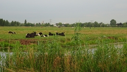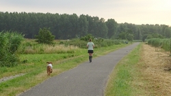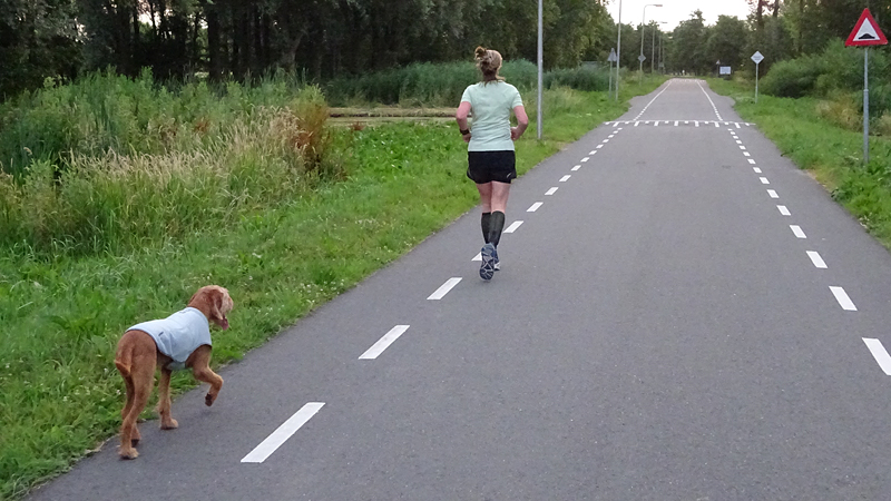Als we het eerste lusje maken, duikt S. alsnog op. Helemaal verwilderd komt hij aanfietsen. Stakker! Omdat ik nu niets bij me had voor woef (geen water en geen bakje), besluiten we eerst een rondje te maken door het nieuwe deel van Hitland zodat we met 5 km weer bij de auto uit zullen komen. Dan klok ik mijn MAF rondje wel af en we pakken de spullen. Zo gezegd zo gedaan en alles loopt eigenlijk prima. S. maakt wat foto’s onderweg van de koetjes en een meerkoetje. Er zijn alweer jonge eendjes en gansjes van de tweede leg. Ik klok de 5 km af op 6.54 min/km met een gemiddelde HF van 133 (max 140 maar dat was maar een paar stappen). Dat is dus niet slecht ondanks de bomen en het keerpunt. Overigens is de temperatuur beter dan gisteren (scheelt 5 graden). De cadans is ook wel goed met 170 gemiddeld (max 174) zonder metronoom. Ik ben daar wel tevreden over en het liep ook makkelijk.