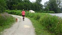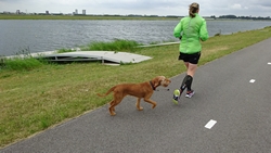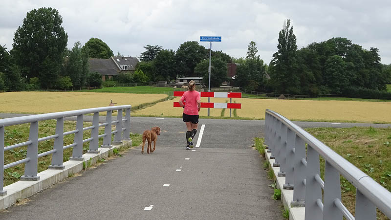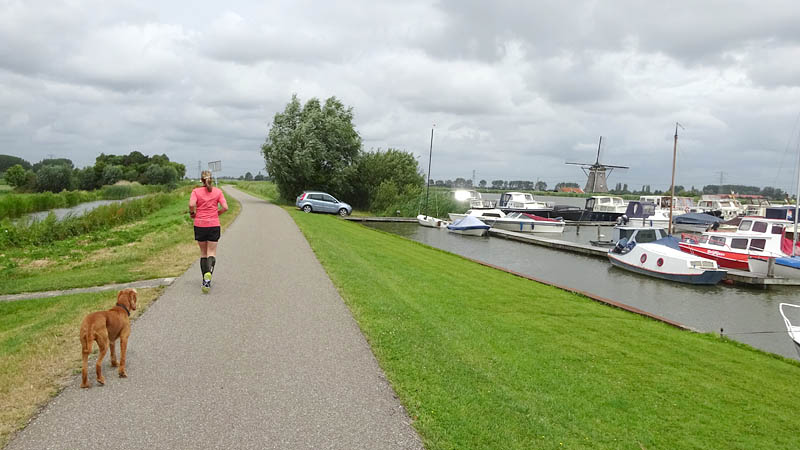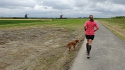 Na de roeibaan kozen we voor een rondje rond de plas en dat is op zondag geen goed idee. Fietsers waar je voor moet oppassen en steeds gedoe met woef en S. op de fiets. Heel onrustig en we hadden beter op de roeibanen kunnen blijven voor dit soort rondjes. Halverwege hing het tongetje van woef er ineens uit en wilde S. haar water geven maar als ik doorloop is daar geen sprake van en heeft ze alleen maar haast om weer bij me te komen. Ik keerde weliswaar om zodat ze niet keihard zou gaan scheuren om me in te halen maar drinken ho maar. Eventjes in het water dan maar en ik hield even een paar passen in zodat ze haar voetjes kon wassen en weer door. Na de kern van 8 km klokte ik dan maar af om haar echt water te geven. Net daarvoor moest ik haar nog ineens grijpen omdat ze te ver op het fietspad liep en er een racer aankwam (dat doet ze dus nooit maar met S. op de fiets is ze altijd bezig met haar roedeltje). Grrrrrr. Ik was dus niet zo tevreden over de run. Het leek wel alsof we er al 20 op hadden zitten terwijl we nog maar 11 km hadden gelopen. Heel merkwaardig.