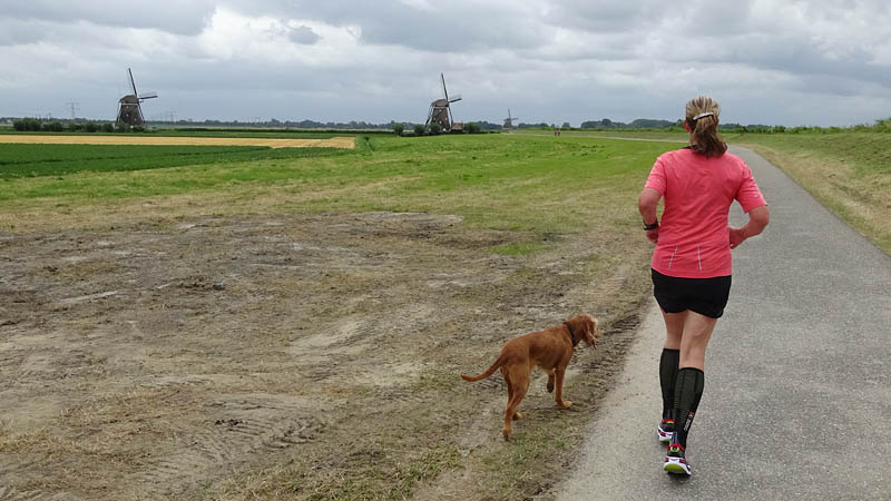 Gisteren kwam het er niet meer van om te gaan lopen en werd het ook een erg warme dag. Vandaag wilde ik wel nog even lopen maar was het weer enorm winderig. Het weer maakt niet uit, maar het was wel opvallend veel wind vandaag en zeker rond de plas en de baan. Het was de bedoeling dat ik vandaag weer een 8 km continu zou lopen aangezien ik wel wat langere continu lopen moet gaan inbouwen in de trainingen voor progressie en voor de HM eind september. Daarom dus vandaag gekozen voor de baan en (stom genoeg) voor een rondje plas. De fiets gaat in de auto en woef wurmt zich erbij.
