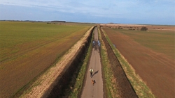 Maar als ik op de weg ben, hobbelt de pouch met de drone alle kanten op en bovendien kruipt de rits steeds open omdat de drone naar voren valt. Dat moet dus anders. Ik maak meteen een eerste video op de weg naast de farm maar die mislukt via het vluchtplan omdat de farm er wel opstaat, maar ik niet. Al doende leert. Ik ben een kilometer bezig om de drone goed vast te krijgen maar uiteindelijk lukt het. Het grote elastiek van de rugzak klemt nu over de pouch en de onderste elastieken klemmen nog een keer alles vast. Ik voel er zo niets van en er hobbelt ook niks meer. Prima dus en even goed onthouden.