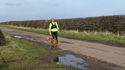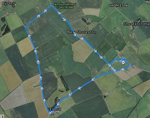 We lopen rustig door naar Elford en daar laat ik de drone weer op. Propellers erop, kalibreren, plan en gaan. Het kost wel tijd maar het gaat al sneller dan de vorige keer. En even later bij de skischans doe ik het nogmaals. Grappig genoeg lijken de foto’s dus op elkaar omdat je alleen de weg ziet met een geel poppetje. Op de eerste foto loop ik richting Bamburgh castle (het is de weg van foto 5), op de rechter foto loop ik richting de Farne Islands. Wij kunnen dat met onze ogen wel prima zien.