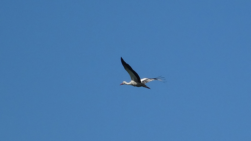 Op een gegeven moment zien we drie ooievaars laag overvliegen. Maar als we in de lucht kijken, zien we er nog 4 hoog in de lucht zweven. Nu zijn het er ineens 7! We stoppen en blijven omhoog kijken naar de prachtig zwevende vogels. Echt bijzonder zo.