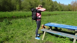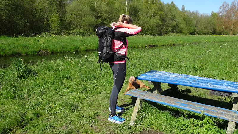 Gisteren hebben we voor het eerst een ‘echt’ fietstochtje van 44 km gedaan en kwam het niet meer van lopen. Een rustdagje qua lopen is natuurlijk geen probleem en zo vertrokken we vandaag dan weer voor een run. Ook vandaag weer een experiment. Ik had deze keer de grote Millet rugzak gevuld met wat spulletjes. Dat is geen minimalistische rugzak zoals de OMM (55L) maar een grote trekkers rugzak (65L) die veel kan hebben maar misschien wel comfortabeler zit met vol gewicht erin. Het eerste stuk liep ik dus met die zak, het tweede deel liep ik met de OMM zak om het verschil te kunnen voelen. Woef hoefde niet, want zij had de vorige keer totaal geen last van het rugzakje. Als ik met de Millet zou kunnen joggen, dan zou zij eventueel helemaal niets mee hoeven dragen (want er kan veel meer in de Millet).