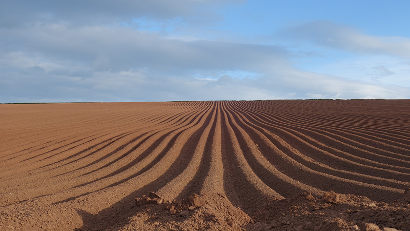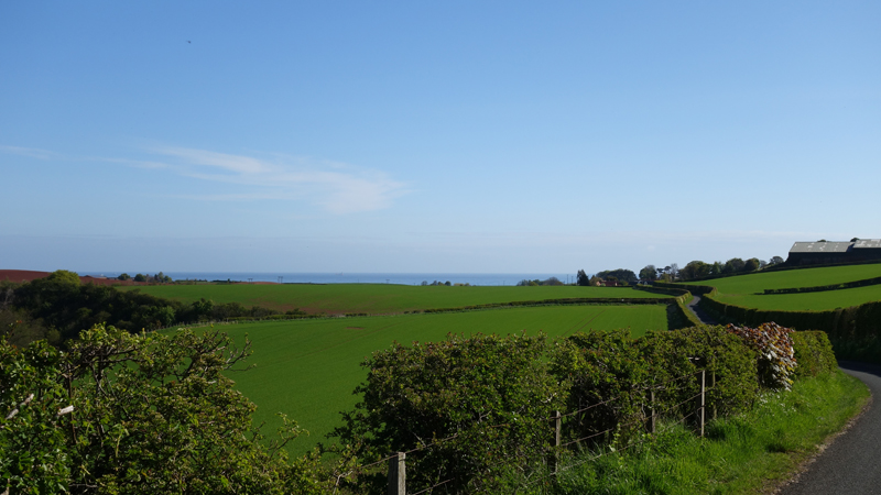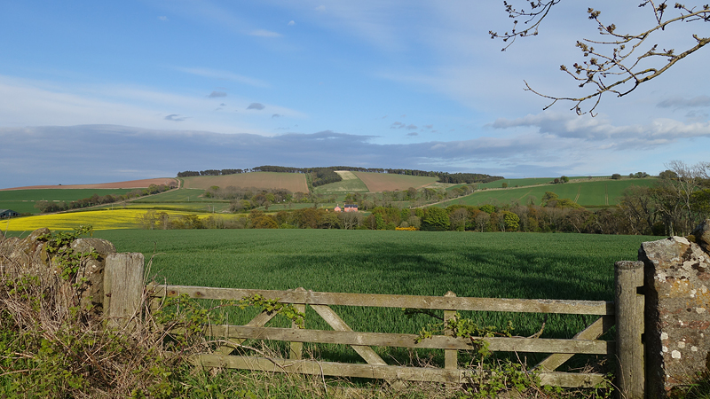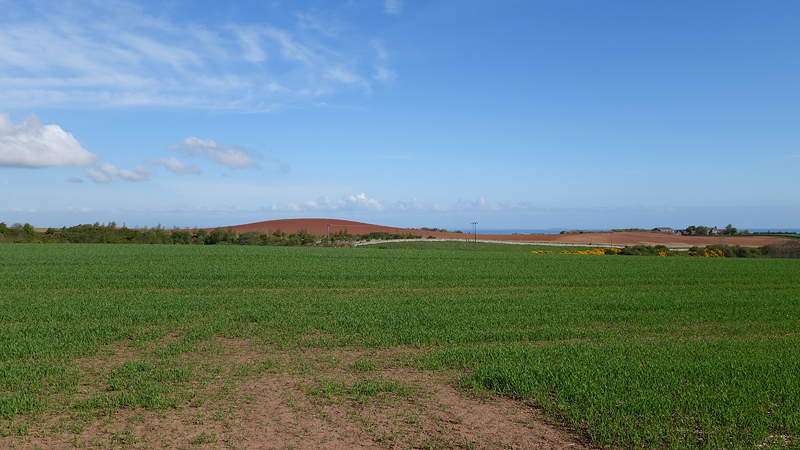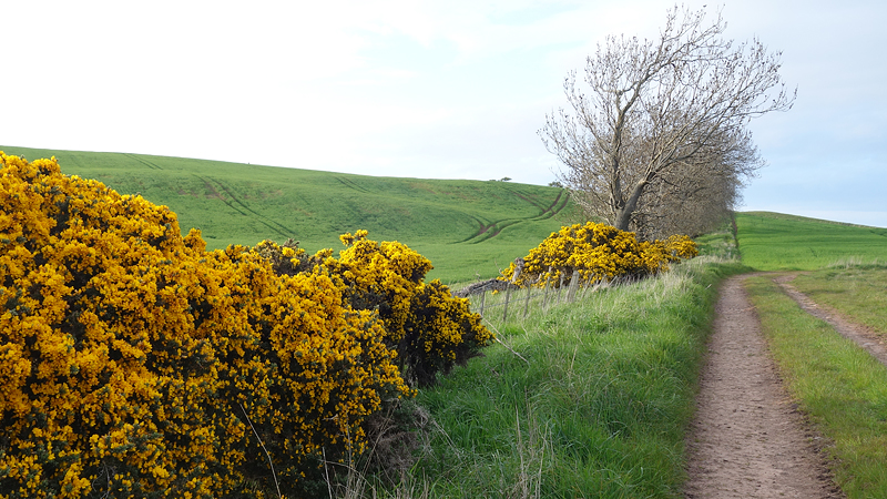 Daarna hobbelden woef en ik weer naar boven langs een omgeploegd veld. Dat geeft een mooi patroon. Helaas ook hier geen reetje. Ik sloeg Doon Hill zelf over want er is verder niks te zien. Na de klim ging het snel. Even linksaf, genieten van de lucht van de gaspeldoorn en weer rechtsaf. Geen vosje deze keer. Aan het einde weer rechtsaf. Gisteren liep ik dit dus de andere kant op. Best grappig want het loopt toch flink naar beneden en gisteren liep ik dit dus weer omhoog.