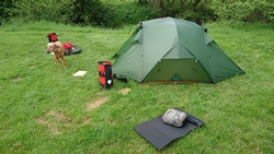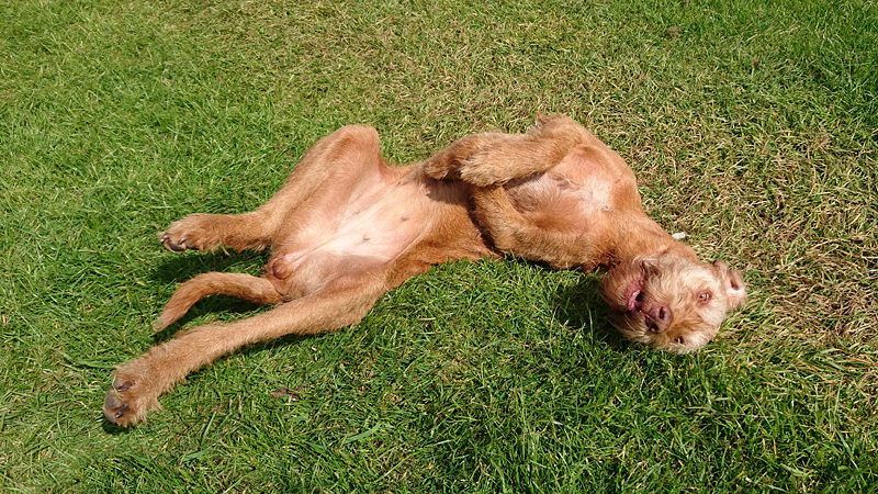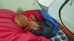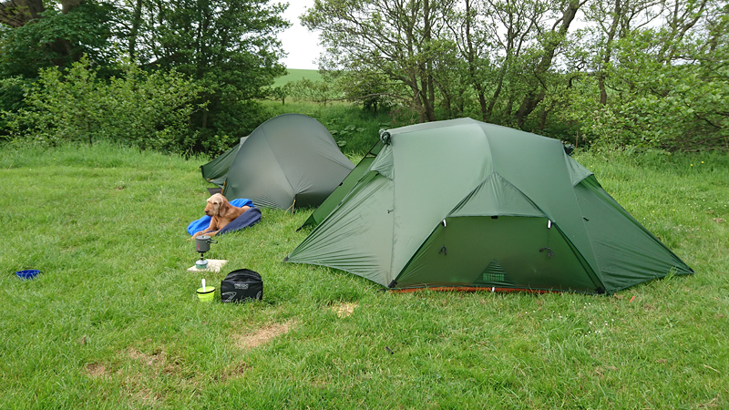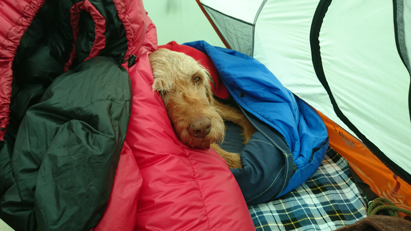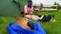 Waf ligt heerlijk op haar noblecamper op het gras in het zonnetje en heeft het duidelijk naar haar zin. Gelukkig zijn de tenten weer droog en is het gras ook droog. Geen condens, niks.