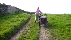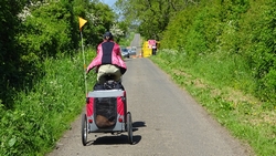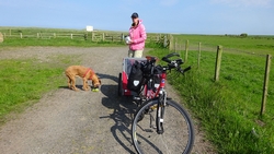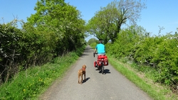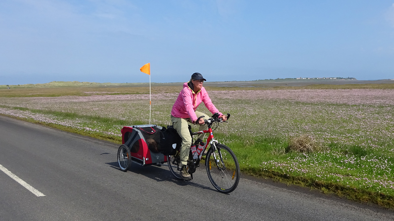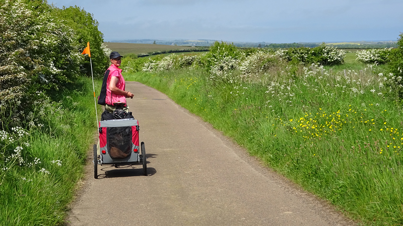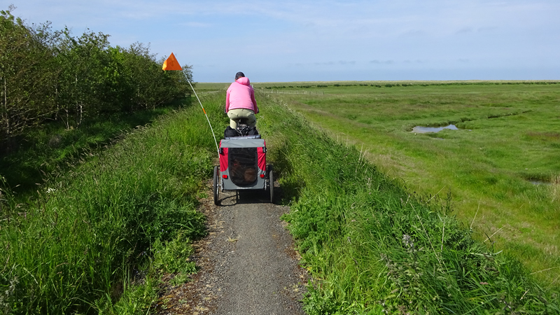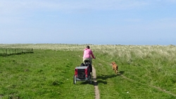 Het pad is afwisselend en fraai. Niet alles is even toegankelijk met de fiets. Ik scheur ergens over een graspad en dat gaat goed ook met de kar. Maar zodra er alleen een smal strookje is en links en rechts hoge opstaande grasranden komen, stap ik af. Woefje dan maar lekker even laten rennen. Wij kunnen ergens wel heel rustig weer verder fietsen en wafje hobbelt letterlijk als een hobbelpaard mee. Ze vindt het prachtig. We kijken op de kaart hoe ver dit rare pad is en waar we haar dan eten zullen geven en weer in de kar kunnen doen. Vandaag houden we er dus echt rekening mee dat ze niet hoeft te rennen na het eten. Ook wordt het bandje weer opgepompt maar tot nu toe gaat het allemaal goed nog met de doggyride. Wel een goede les.