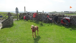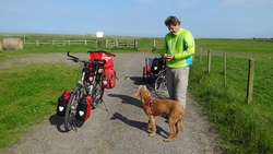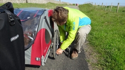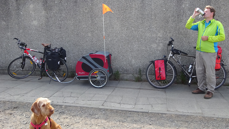 Als we bij het hek terugkomen, staan de fietsen er gelukkig nog. We konden alles ook wel zien van een afstandje maar dat zegt niets natuurlijk. We gaan weer terug naar het dorpje. Bij de toiletten maken we even een stopje nog en natuurlijk wordt de doggyride weer opgepompt.