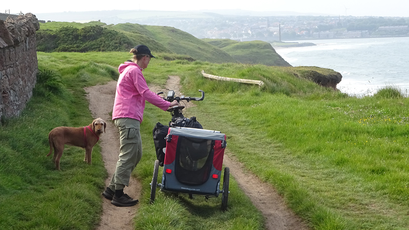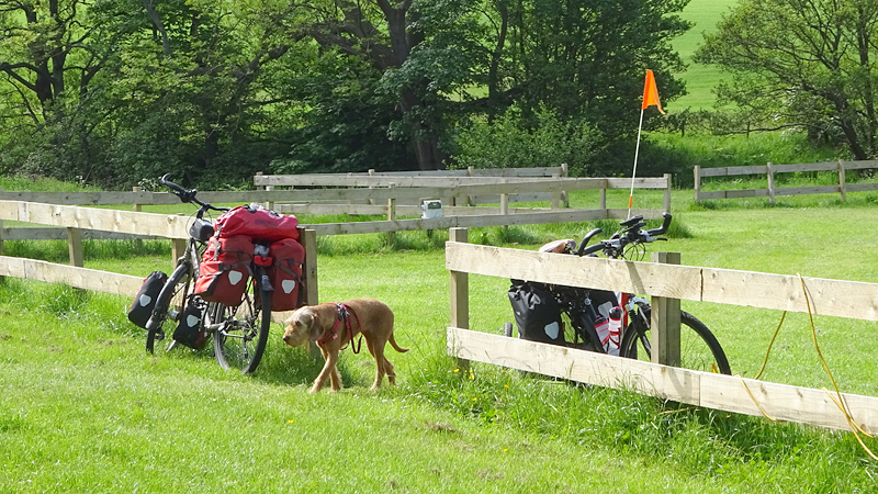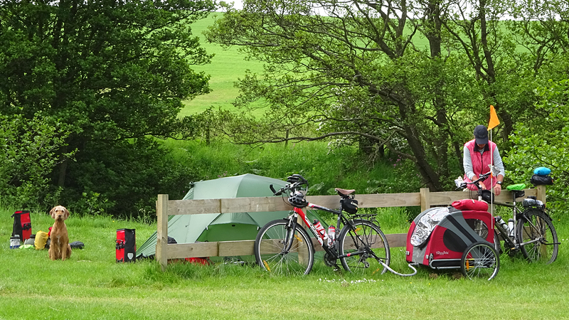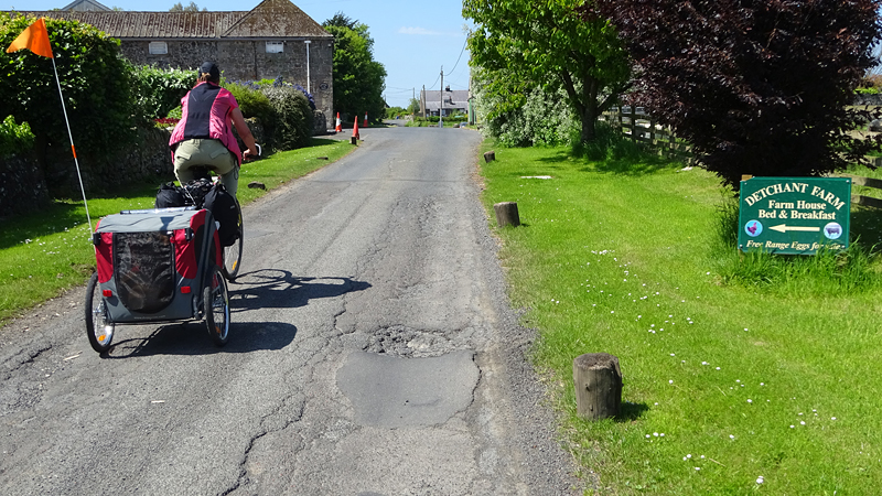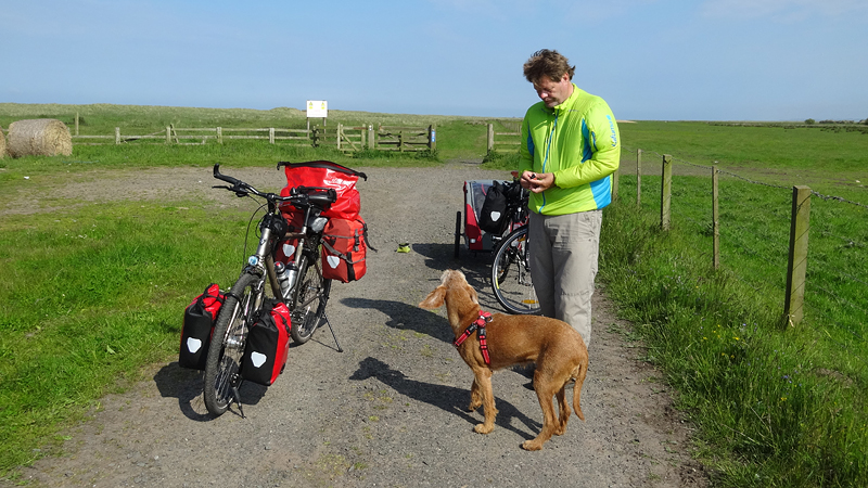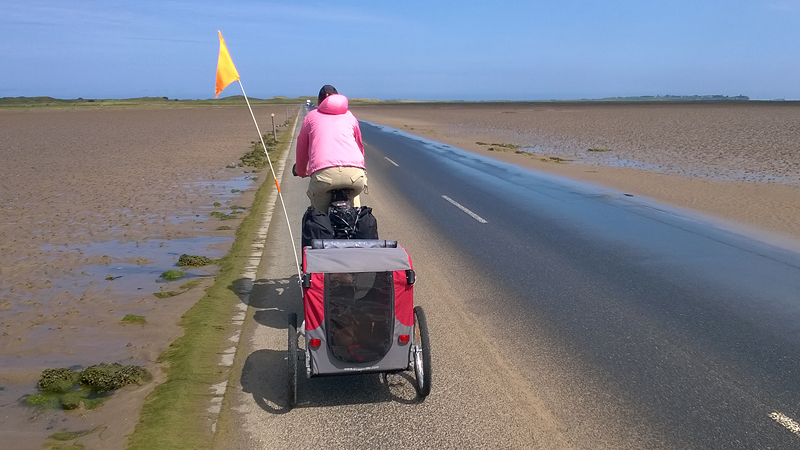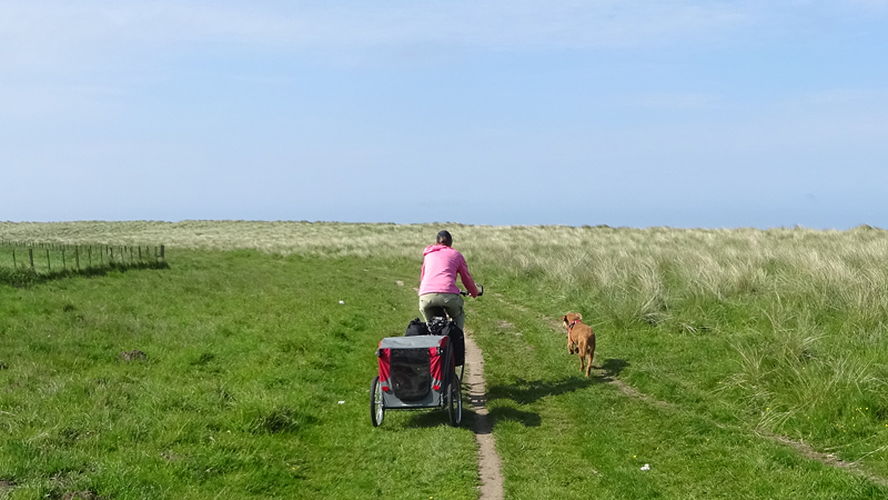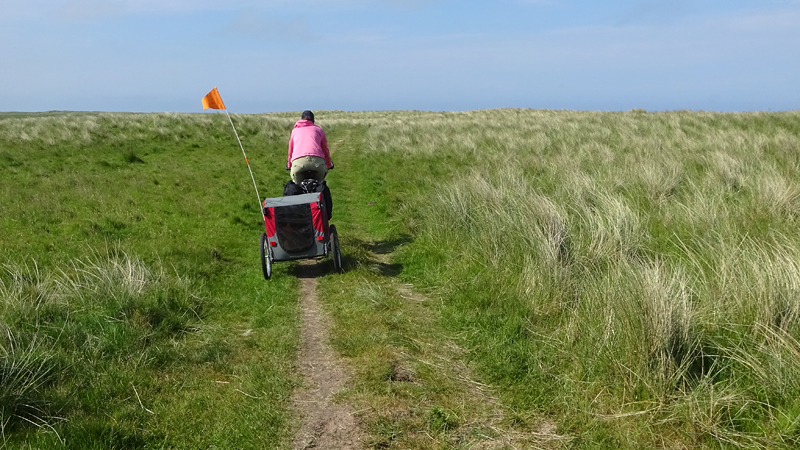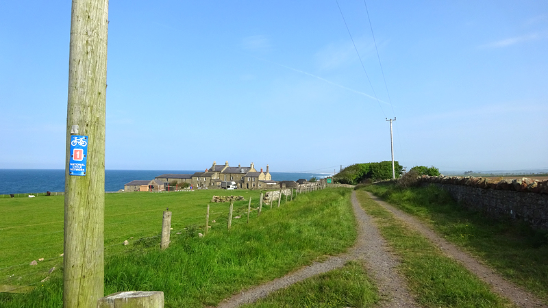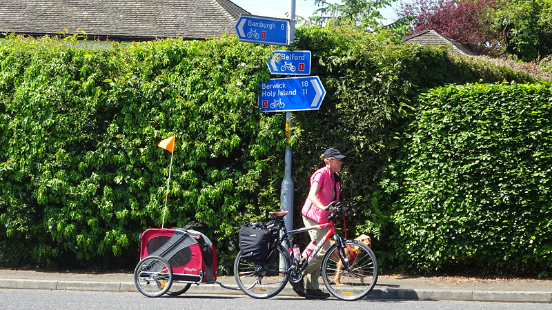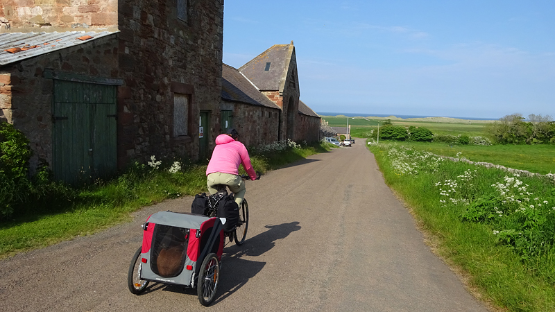 Het pad daarna is niet te doen. Waf gaat uit de kar en we geven het op. Het zal niet lang duren dus het is gewoon een kwestie van niet zeiken en doorlopen ook al gaat het niet snel. Ineens komen we een meisje tegen dat ook haar fietsje duwt. Het is inmiddels ruim na 18 uur en ze vertelt ons dat ze naar Bamburgh wil fietsen met haar bepakte fiets. We zijn nogal verrast. Ook al zijn wij extreem traag, met deze paden gaat ze Bamburgh echt niet halen voordat het donker is. Zelfs niet over de A1. We doen de suggestie dat ze bij Barn at Beal gaat slapen met de tent, de plek waar wij gegeten hebben tussen de middag. Dat lijkt me al uitdagend genoeg qua afstand nu. Als zij op dit pad niet kan fietsen, kan ze dat verderop ook niet. Ik gaf het alleen op vanwege de kar. Ik ben benieuwd waar ze is uitgekomen uiteindelijk en weer ben ik verrast door het gebrek aan realiteitszin en voorbereiding van een route. Dan doen wij dat toch een stuk beter.