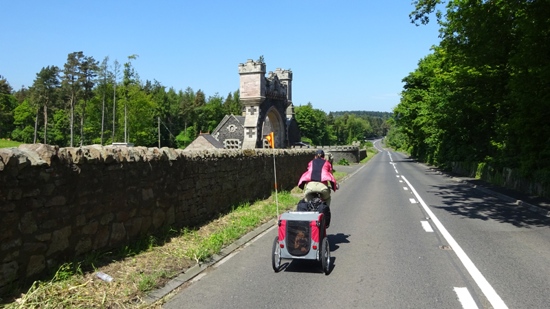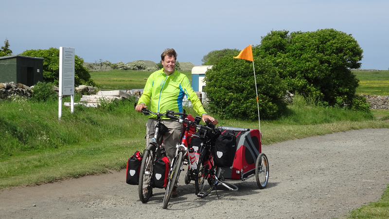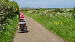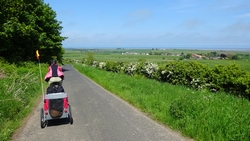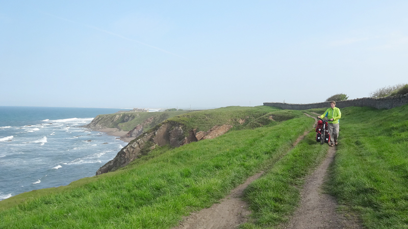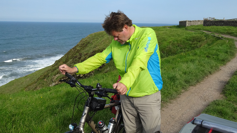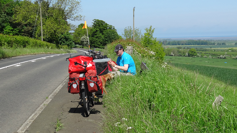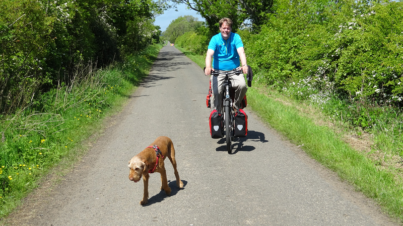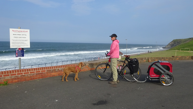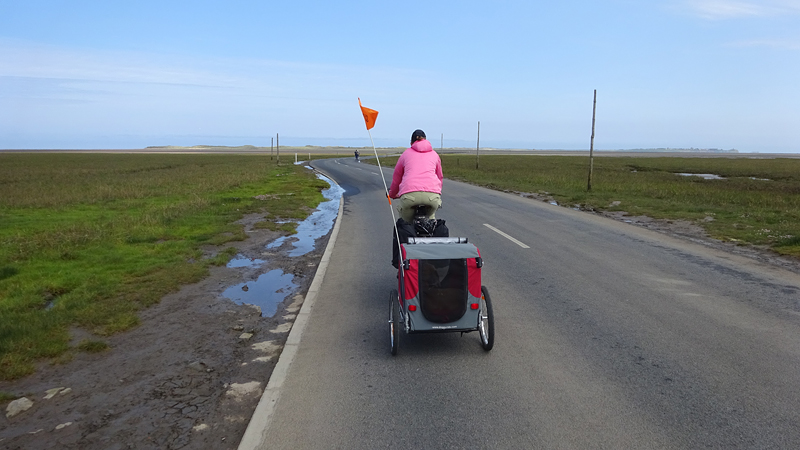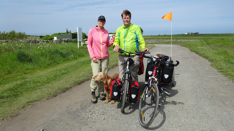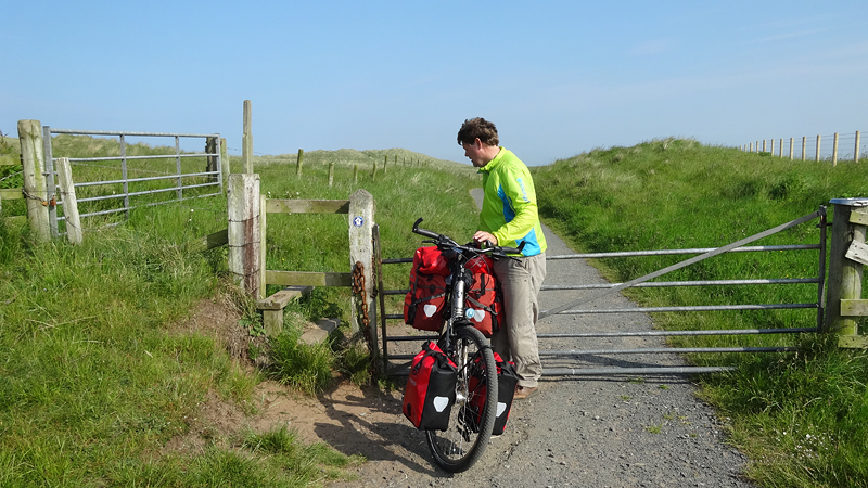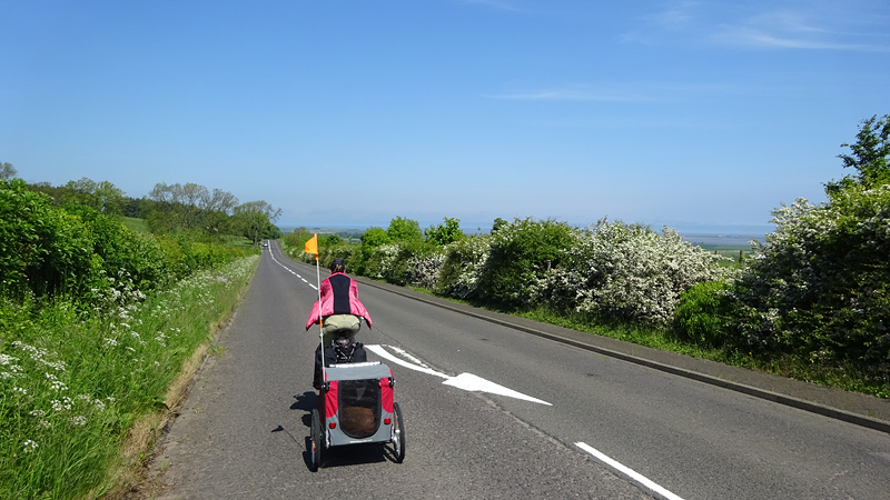 Het pad daarna is niet te doen. Waf gaat uit de kar en we geven het op. Het zal niet lang duren dus het is gewoon een kwestie van niet zeiken en doorlopen ook al gaat het niet snel. Ineens komen we een meisje tegen dat ook haar fietsje duwt. Het is inmiddels ruim na 18 uur en ze vertelt ons dat ze naar Bamburgh wil fietsen met haar bepakte fiets. We zijn nogal verrast. Ook al zijn wij extreem traag, met deze paden gaat ze Bamburgh echt niet halen voordat het donker is. Zelfs niet over de A1. We doen de suggestie dat ze bij Barn at Beal gaat slapen met de tent, de plek waar wij gegeten hebben tussen de middag. Dat lijkt me al uitdagend genoeg qua afstand nu. Als zij op dit pad niet kan fietsen, kan ze dat verderop ook niet. Ik gaf het alleen op vanwege de kar. Ik ben benieuwd waar ze is uitgekomen uiteindelijk en weer ben ik verrast door het gebrek aan realiteitszin en voorbereiding van een route. Dan doen wij dat toch een stuk beter.