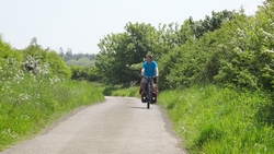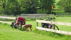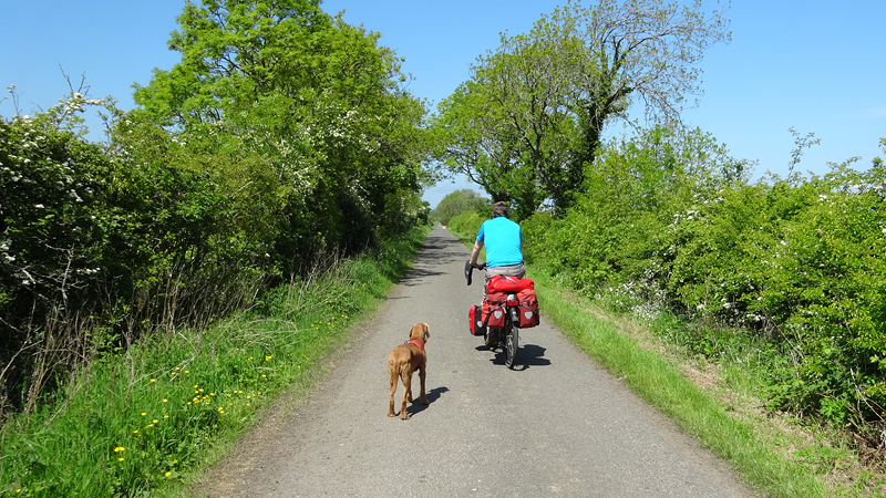 We besluiten door te rijden. Het is een prachtige weg die vriendelijk op en neer golft maar de andere kant op toch niet zo lekker zal rijden als we terug moeten. Twee racefietsers halen ons in en komen we niet meer tegen. Zouden wij dan ook verder kunnen? Omdat het zo heerlijk rustig is, laten we woef een klein stukje meelopen zodat ze kan plassen.
