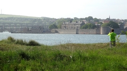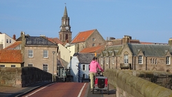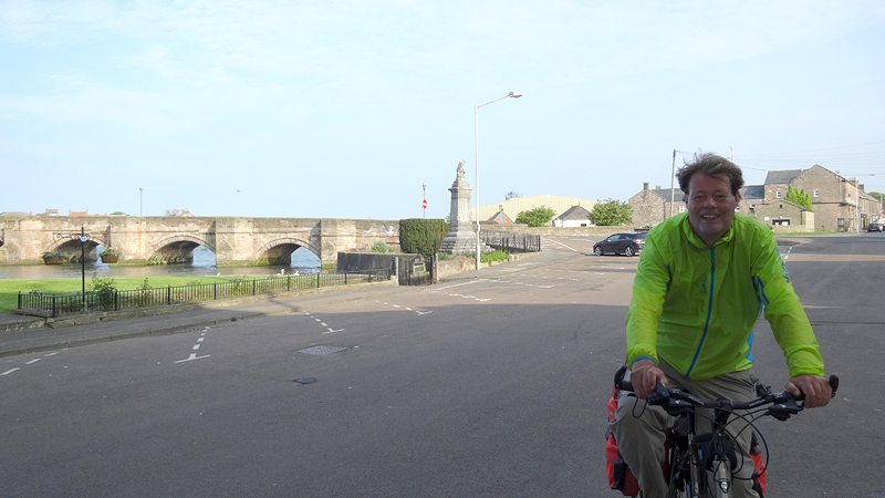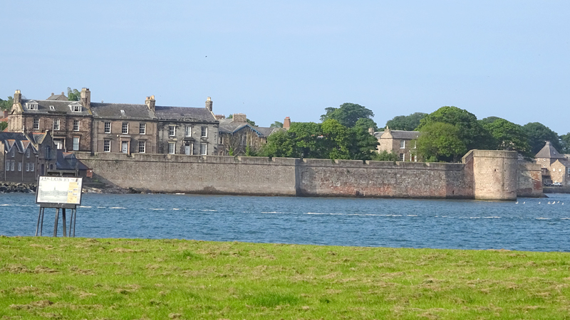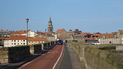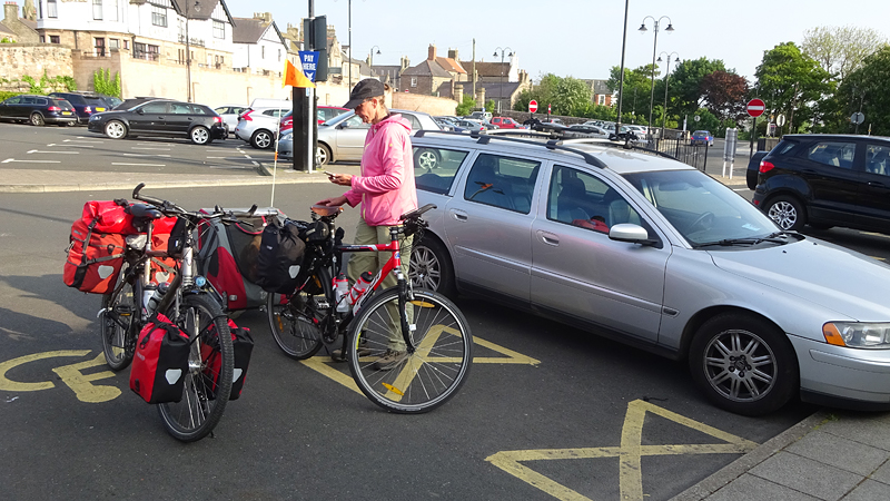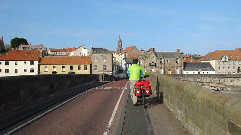 Berwick ziet er best aantrekkelijk uit zo van deze kant met het kerkje en de mooie vestingmuren. Na de brug weten we even niet meer hoe we verder moeten en we kijken op de kaart en vragen de weg. We moeten even linksaf na de brug maar dat blijkt geen makkie. Zo gigantisch steil, daar kunnen we niet fietsen. Waf weer uit de kar en duwen maar!
