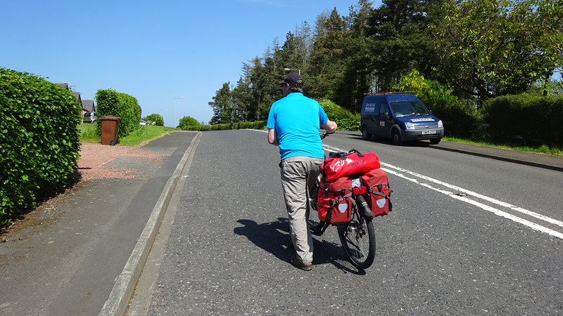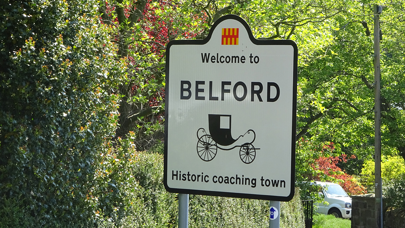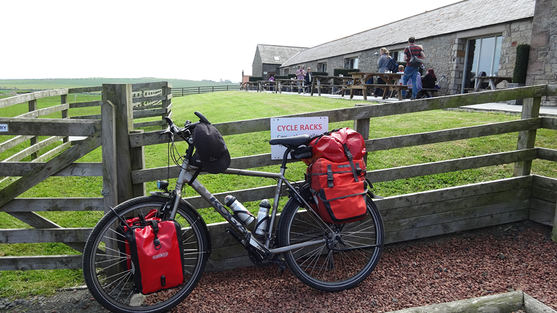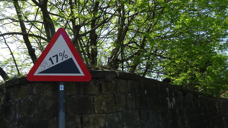 We moeten vlak voor Belford even de A1 oversteken maar er komt geen enkele auto aan en we hoeven zelfs niet af te stappen. Dat is wel een meevaller. Maar daarna gebeurt het. Een klim van… 17%. Ik zie het bordje, ik zie de weg en ik stap meteen af. Daar ga ik niet eens aan beginnen.
