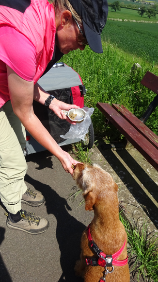 Inmiddels is het al 12 uur en we besluiten te stoppen op een mooi punt om woefje eten te geven en even zelf wat te drinken. Achter ons is het uitzicht echt geweldig. Ook hier dus weer tijdverlies….