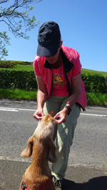 Waf gaat uit de kar en loopt braaf op de stoep mee. Volgende keer een langer riempje aan haar harnasje. We zien van links twee racefietsers ook met de fiets aan de hand de helling opkomen. We zijn dus niet de enige gelukkig.
