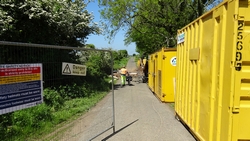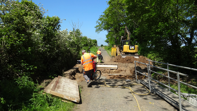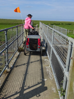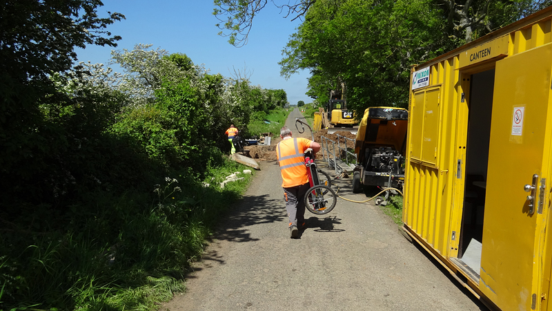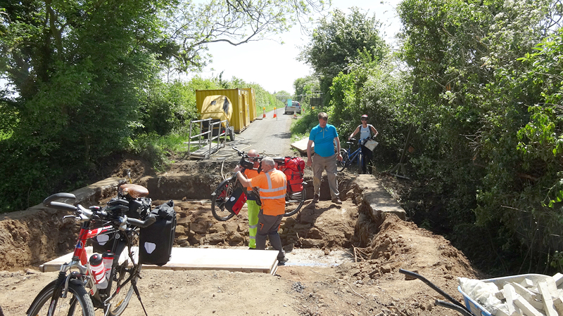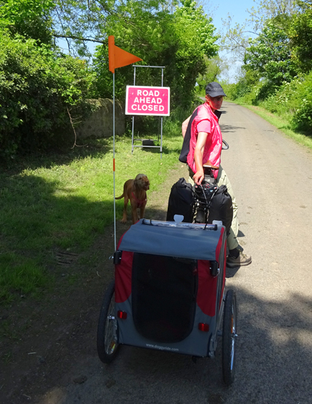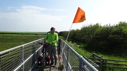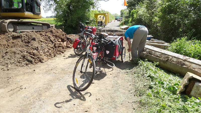 Dan ineens zien we de opbreking. Compleet met hekken en al. Er staat een man bij die ons vertelt dat we terug moeten over de A1. Maar die race fietsers dan? Hij vertelt dat ze die geholpen hebben maar dat wij te zwaar zijn zo met de kar. Welnee, de kar kan eraf en kan klein en de fietsen vallen ook wel mee. Please?? Zo gebeurt het ook en al snel is woef uit de kar, is de kar losgekoppeld en worden alle spullen door de mannen over de open brug gedragen over een smalle balk. Wij vinden het niet zo spannend allemaal maar als er iemand invalt, hebben zij een probleem natuurlijk. Er komt toevallig nog een dame aan op een racefiets en ook zij heeft geluk en wordt geholpen. Wij zijn blij. S pompt de band van de doggyride weer eens op en daarna fietsen we verder. Heerlijk rustig zo zonder auto’s natuurlijk en de route is erg mooi.
